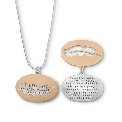 Honor a lost loved one and find comfort through the grief with this heartfelt Kathy Bransfield piece. The two piece oval pendant (3/4" x 1.25") features a feather carved into the top piece crafted from 22KT gold over brass, while the bottom piece is hand stamped sterling silver featuring the quote, "Those we love don't go away, they walk beside us every day, unseen, unheard, but always near, still missed and very dear." This moving necklace is completed with a 20" sterling silver snake chain.