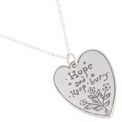 Uplift spirits with this Laurel Elliott DVB necklace featuring a quote by the incomparable Louisa May Alcott from her book, 'Little Women.' The 'Hope & Keep Busy' necklace has a beautifully and intricately decorated 1.25" x .875" sterling silver heart pendant with a matching 18" sterling silver chain.