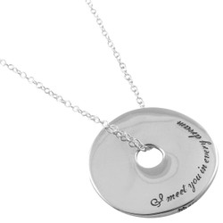 A graceful reminder that we are never alone can be found in this Laurel Elliott DVB necklace, featuring a quote from Alexander Hamilton. The pendant is a 1" sterling silver disc with the quote, "I meet you in every dream." The pendant hangs gracefully from an 18" sterling silver chain threaded through a hole in the center of the disc.