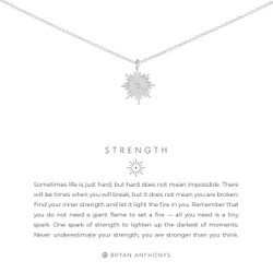 This necklace is presented on a card with the following description, "Sometimes life is just hard, but hard does not mean impossible. There will be times when you will break, but it does not mean you are broken. Find your inner strength and let it light the fire in you. Remember that you do not need a giant flame to set a fire - all you need is a tiny spark. One spark of strength to lighten up the darkest of moments. Never underestimate your strength, you are stronger than you think."